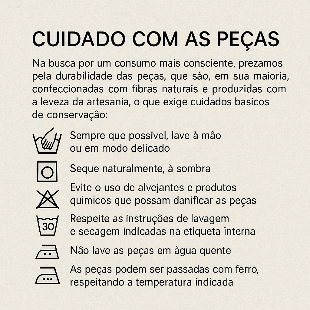 Na busca por um consumo mais consciente, prezamos pela durabilidade das peças, que são, em sua maioria, confeccionadas com fibras naturais e produzidas com a leveza da artesania, o que exige cuidados básicos de conservação.